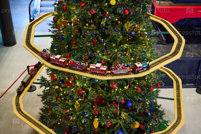 Красиво украшенная рождественская елка, элегантно демонстрирующая очаровательный набор поездов