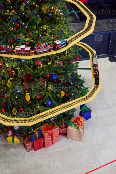 Красиво украшенная рождественская елка с восхитительным набором поездов и множеством подарков