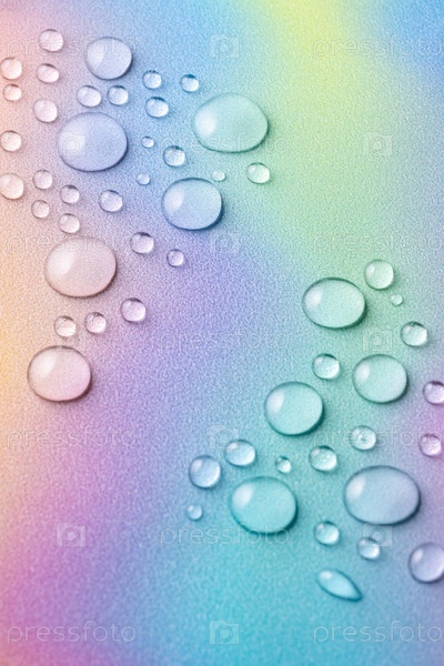Большие капли воды на разноцветном радужном фоне. Избирательный фокус