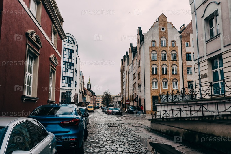 Городская улица в пасмурный дождливый день, заброшенный маленький городок в осенний день