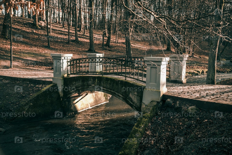 Пешеходный мост через воду, яркий дневной пейзаж, голубое небо и берег реки