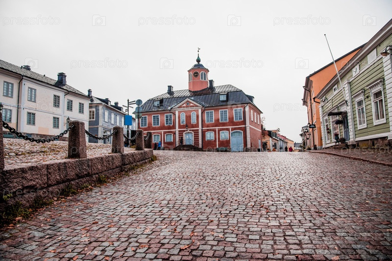 Городская улица в пасмурный дождливый день, городок в осенний день.Старая ратуша Порвоо