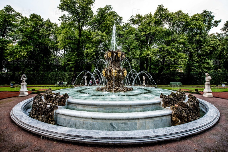 Красивый классический каскадный фонтан в зеленом городском парке, зона отдыха для туристов