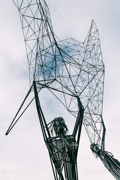 Современная бронзовая статуя мужчины и женщины на фоне облачного туманного неба