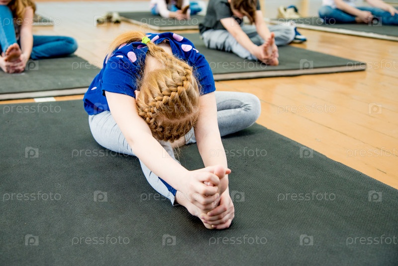 Дети занимаются йогой на коврике в спортзале, спортивное развитие для подростка
