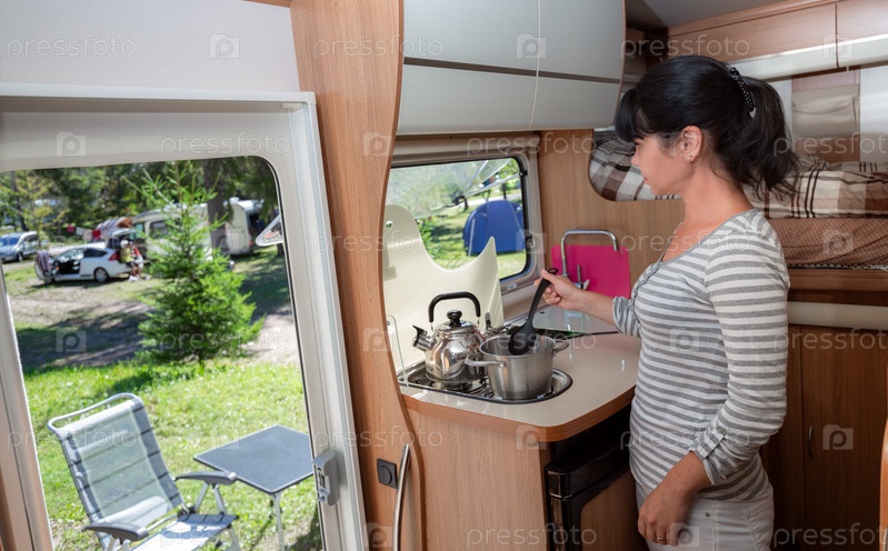 Женщина готовит в кемпере, интерьер автодома RV