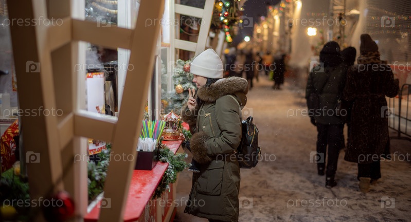 Женщина делает покупки на рождественском уличном рынке, выбирая подарки.Рождественские покупки