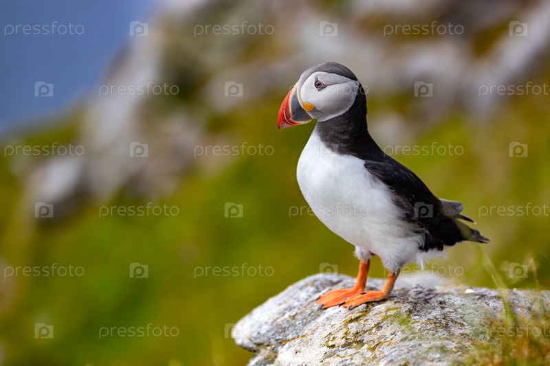 Атлантический тупик (Fratercula arctica) на скале на острове Рунде, Норвегия