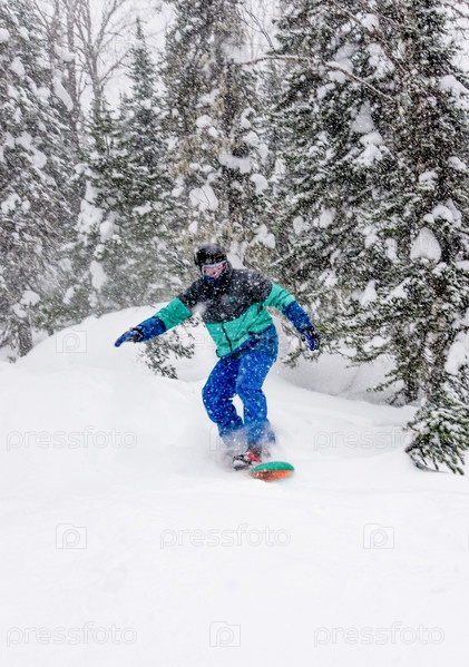 Сноубордист скользит по снежному склону, райдер отдыхает на горнолыжном курорте, экстремальные виды спорта