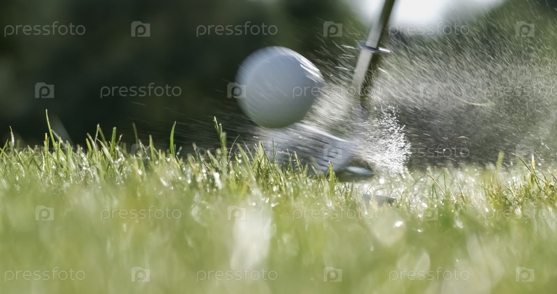 Клюшка для гольфа ударяет по мячу для гольфа. Капли утренней росы и частицы травы поднимаются в воздух после удара