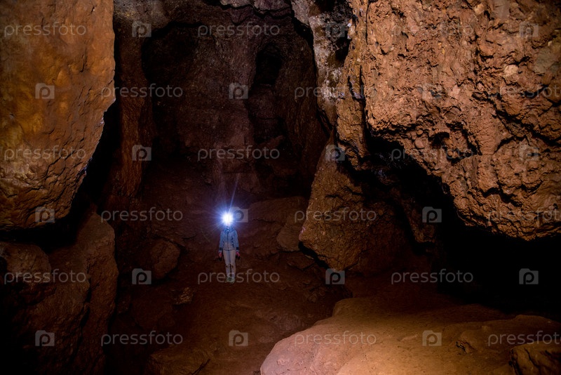 Спелеолог исследует подземную пещеру, геолог изучает отверстие в скале горы