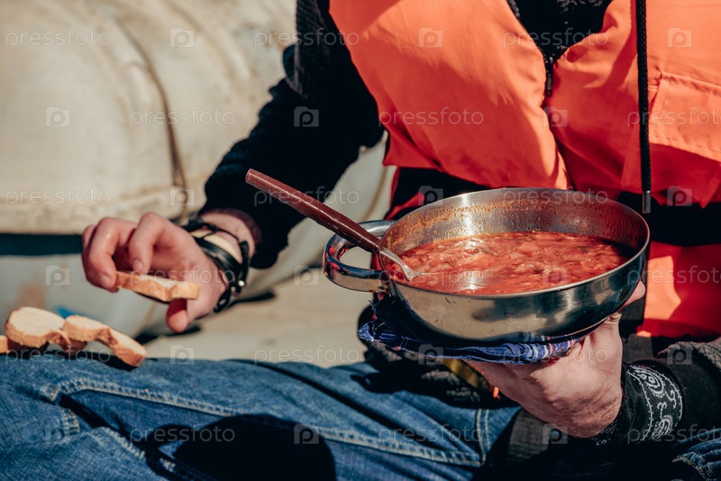 Походная кухня, путешественники готовят еду в горшках на костре, турист ест суп