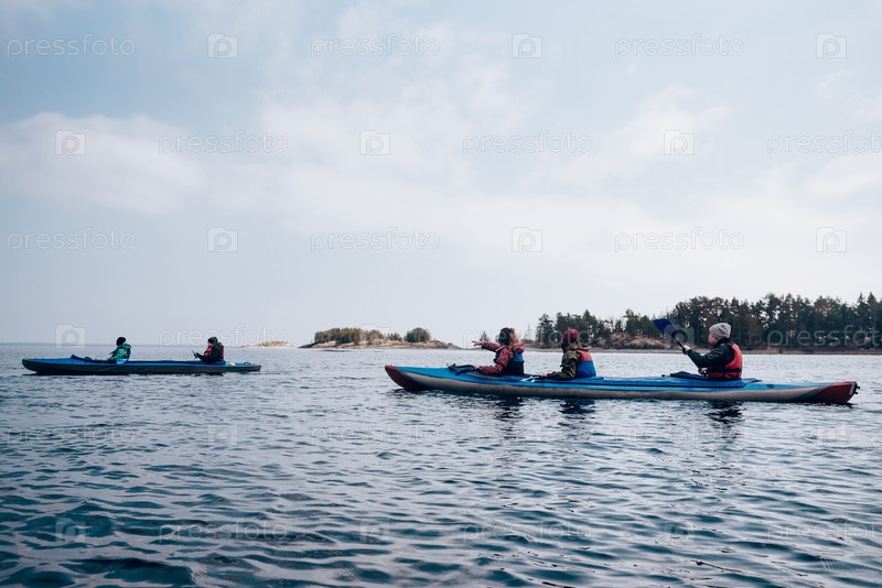 Активный отдых на озере, каякинг на воде, туризм в пасмурный день