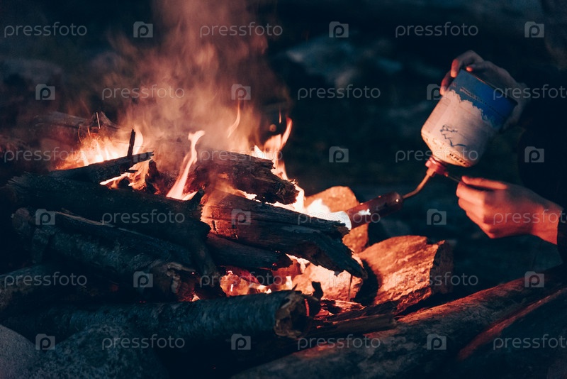 Костер в туристическом кемпинге, пеший туризм на выходных, пламя костра