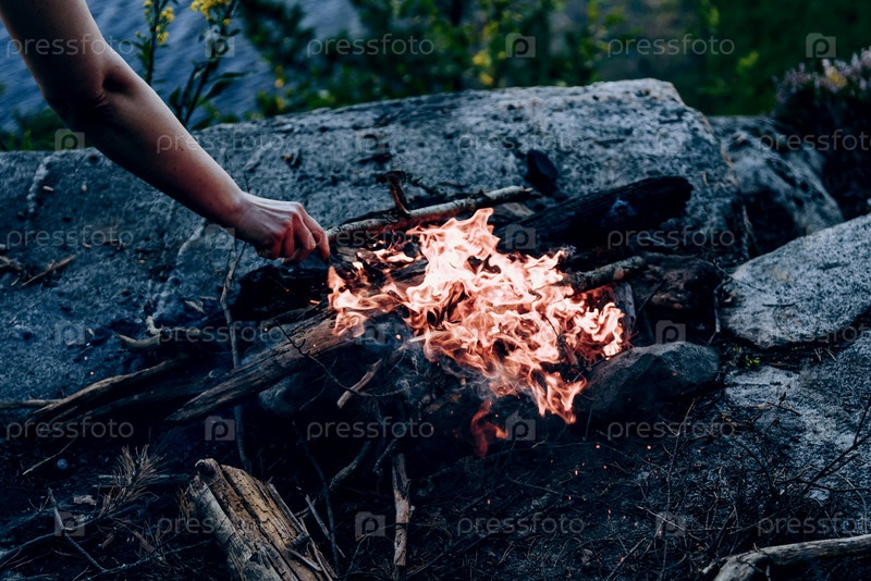 Костер в туристическом кемпинге, пеший туризм на выходных, пламя костра