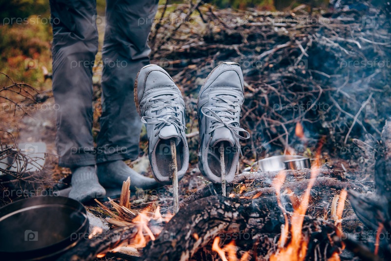 Турист сушит обувь и кроссовки у костра на туристическом лагере, поход на выходные