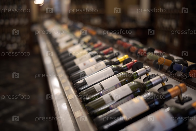 Ряд винных бутылок с сухим красным и белым вином на деревянном. Низкая глубина резкости