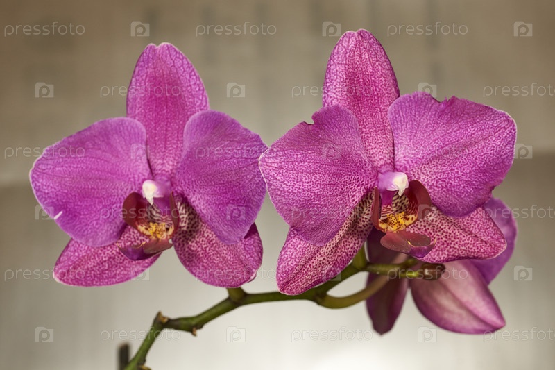 Яркие фиолетовые цветы орхидеи на нейтральном фоне представляют элегантную красоту природы. Крупный план ярких фиолетовых орхидей с нежным пятнистым узором на лепестках