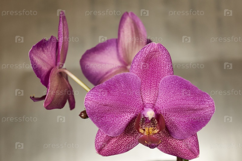 Яркие фиолетовые цветы орхидеи на нейтральном фоне представляют элегантную красоту природы. Крупный план ярких фиолетовых орхидей с нежным пятнистым узором на лепестках