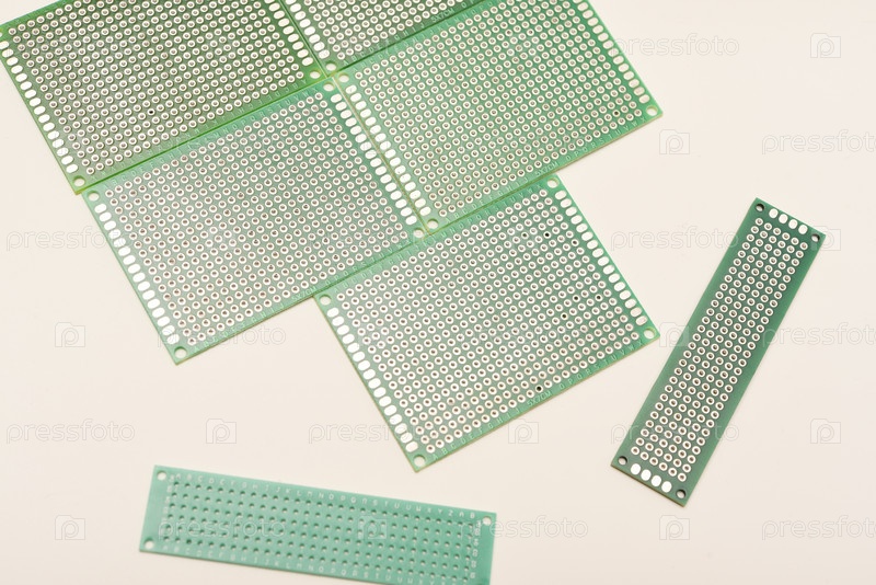 Зеленая макетная плата для электроники на белом фоне. Печатные платы для монтажа радиоэлементов