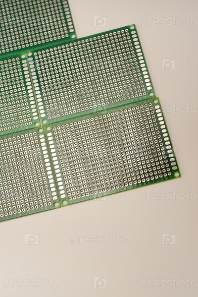 Зеленая макетная плата для электроники на белом фоне. Печатные платы для монтажа радиоэлементов