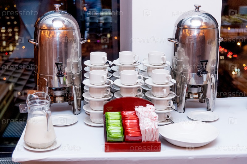 Пустые стеклянные чашки, большой металлический чайник и цветные чайные пакетики на столе, перерыв на кофе на мероприятии