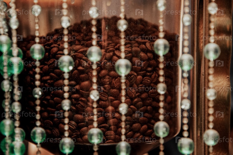 Кофейные зерна в стеклянной вазе, вкусный ароматный черный кофейный напиток в кофейне