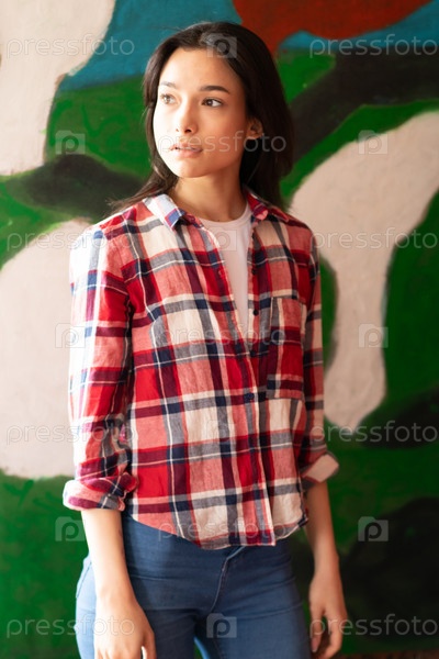 Молодая красивая женщина позирует в красной клетчатой рубашке в студии
