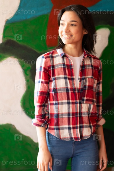 Молодая красивая женщина позирует в красной клетчатой рубашке в студии