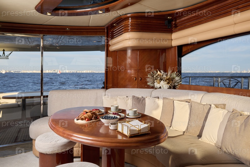 Роскошный интерьер яхты, демонстрирующий потрясающий и живописный вид на океан