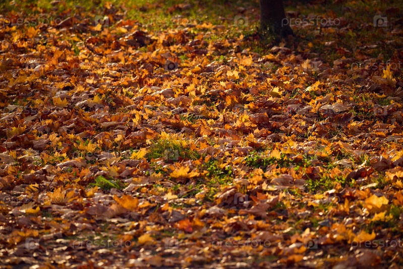 Осенние листья мягко лежат на земле в тихом и безмятежном парке под солнцем