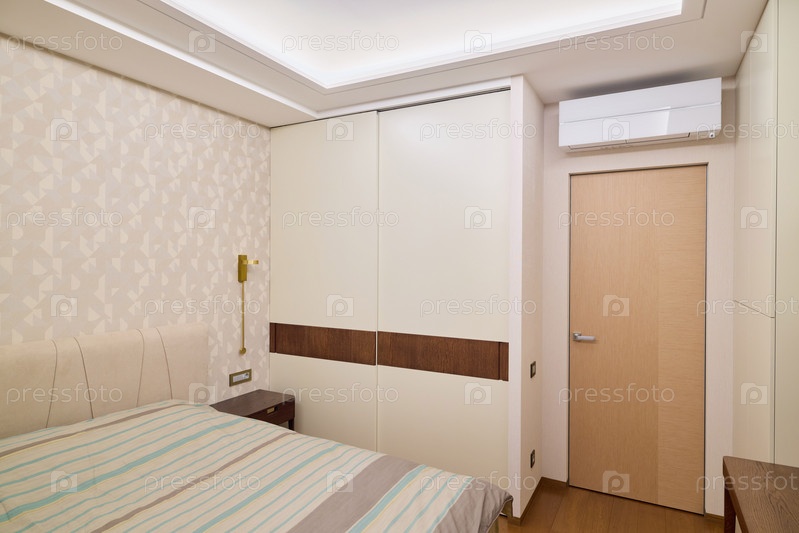 Современный интерьер спальни с элегантным и стильным дизайном и кондиционером