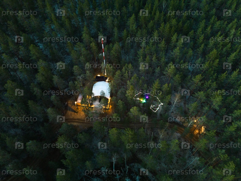 Панорамный вид с воздуха на удаленную базу, окруженную густым лесом