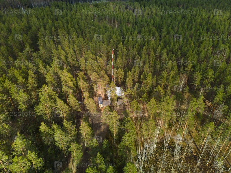 Вид с воздуха на удаленный лесной участок с оборудованием и природным окружением