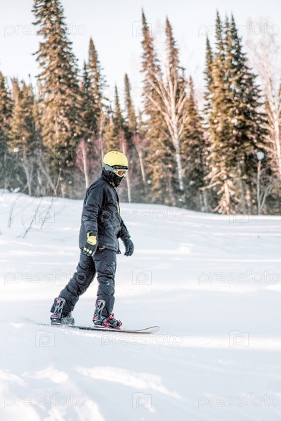 Сноубордист скользит по снежному склону, райдер отдыхает на горнолыжном курорте, экстремальный вид спорта