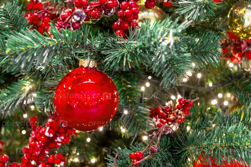 Яркие красные украшения на елке — это шары и ягоды