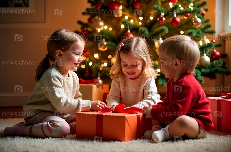 Дети - две девочки и мальчик радуются подаркам под елкой. Крупный план