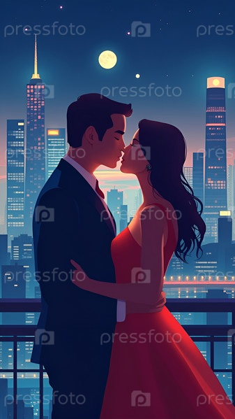 Мужчина в костюме и женщина в красном вечернем платье обнимаются на балконе под полной луной. Силуэты целующейся пары на фоне огней ночного города. День святого Валентина