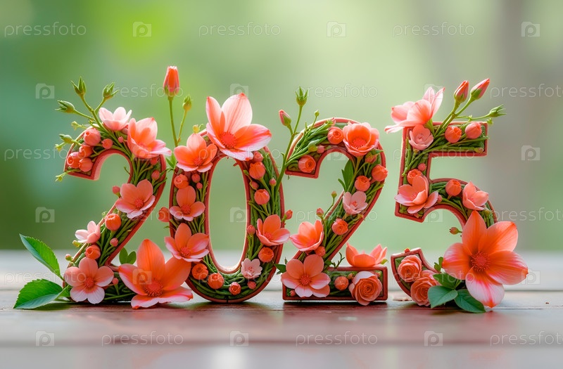 Цифры 2025 украшены нежными красными цветами на зеленом фоне. Цветущий Новый год
