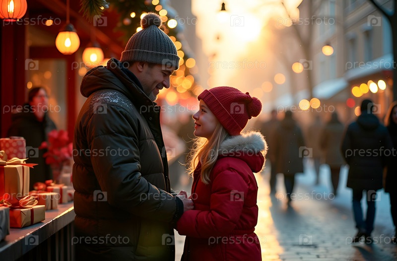 Отец и дочь на рождественской ярмарке обсуждают выбор подарка