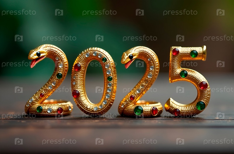 Цифры 2025 в виде змей из золота, украшенные драгоценными камнями. Ювелирный Новый год
