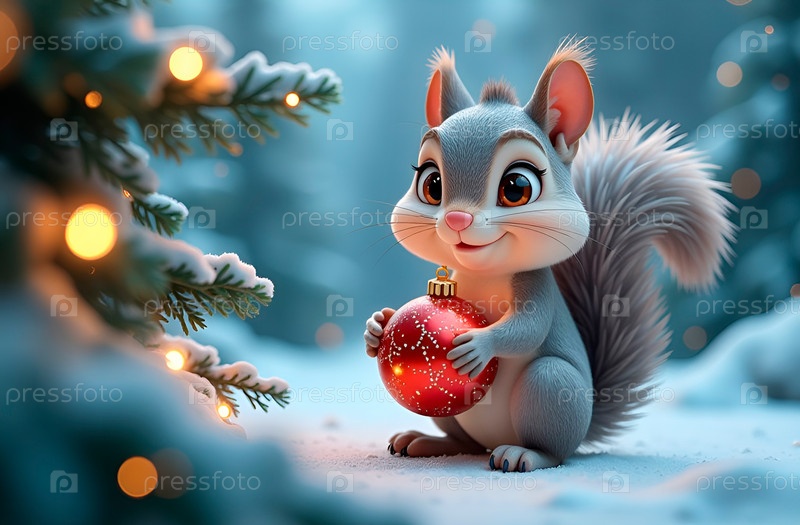 Серая мультяшная белка с красным елочным шаром в зимнем заснеженном лесу. Рождественская открытка