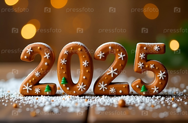 Цифры 2025 из имбирного пряника, украшенные сахарными снежинками и зелеными елочками. Новогодняя атмосфера для кондитерской