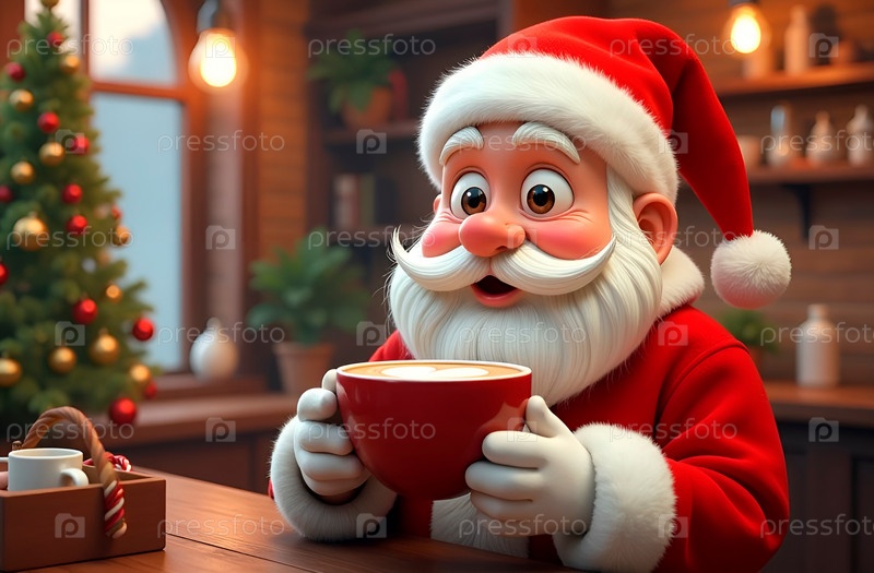 ?мультяшный Санта-Клаус пьет кофе с пенкой в красной чашке в кофейне с рождественской елкой