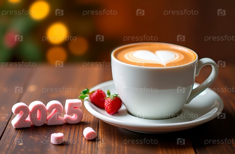 Цифры 2025 из клубничного зефира и чашки кофе с пеной в форме сердца. Уютная атмосфера Нового года и Рождества. Копировать пространство. Открытка. Кондитерские, кофейни, рестораны