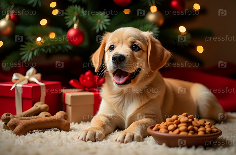 Щенок золотистого ретривера радуется угощению в качестве подарка возле рождественской елки