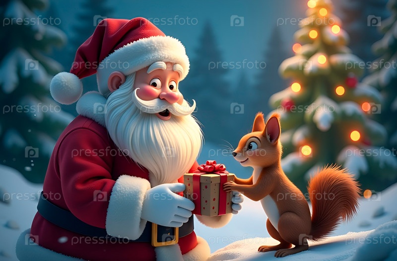 Мультяшный смешной Санта Клаус поздравляет белку и дарит ей подарок в рождественскую ночь в сказочном заснеженном лесу. Поздравительная открытка