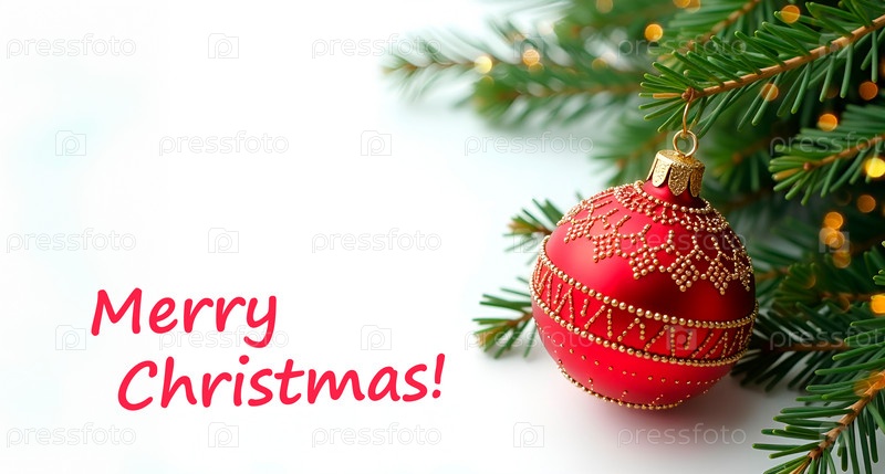 Рождественская открытка с красным шаром, ветвью елки и надписью. белый фон, copyspace