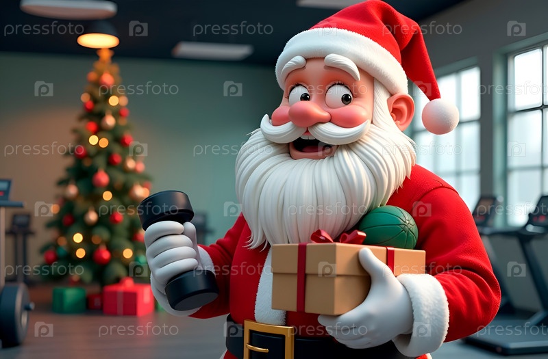 Забавный мультяшный Санта-Клаус с гантелями, мячами и другим спортивным инвентарем в качестве подарка в спортзале с елкой желает Счастливого Рождества. Фитнес и забота о здоровье в новом году