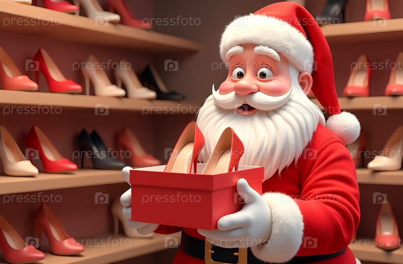 Санта-Клаус в своем классическом красном костюме взволнованно держит красную коробку с красными туфлями на высоком каблуке внутри красочного обувного магазина, заполненного разнообразной обувью
